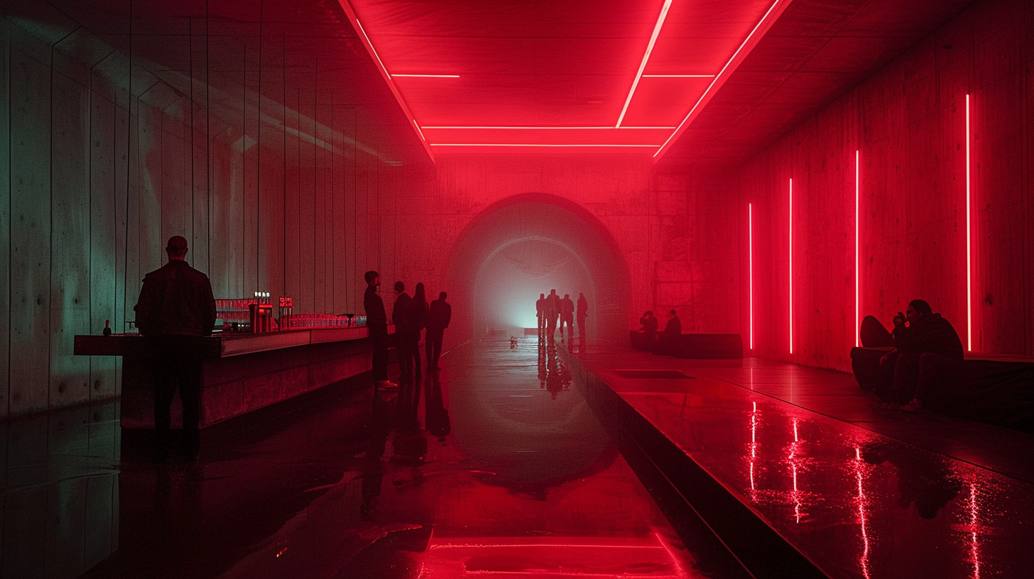 Visitors arrive through a hidden door, pass through luminous corridors, and enter a sequence of chambers that gradually shift light, sound, and atmosphere — guiding the night from seduction into deeper states of collective rhythm and release.